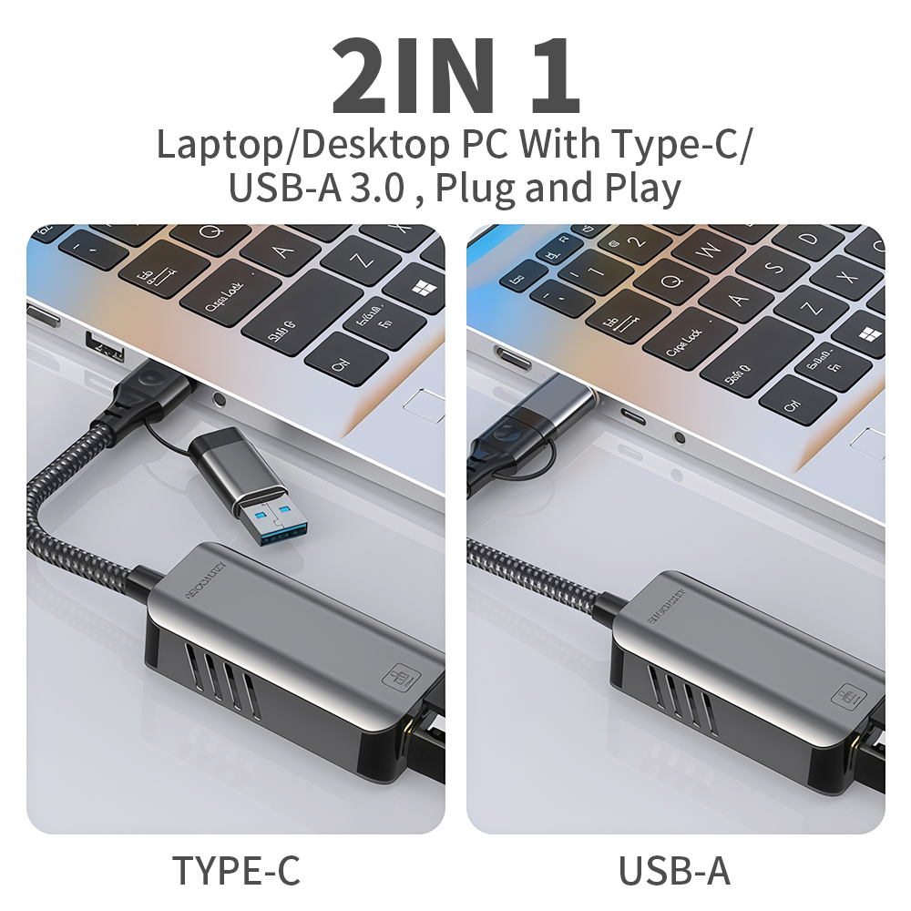 5Gbps USB 3.0 Type C Ethernet Adapter 2 in 1 USB C to RJ45 Wired Network Card 5000Mbps Lan Adapter for Laptop Macbook Cell Phone